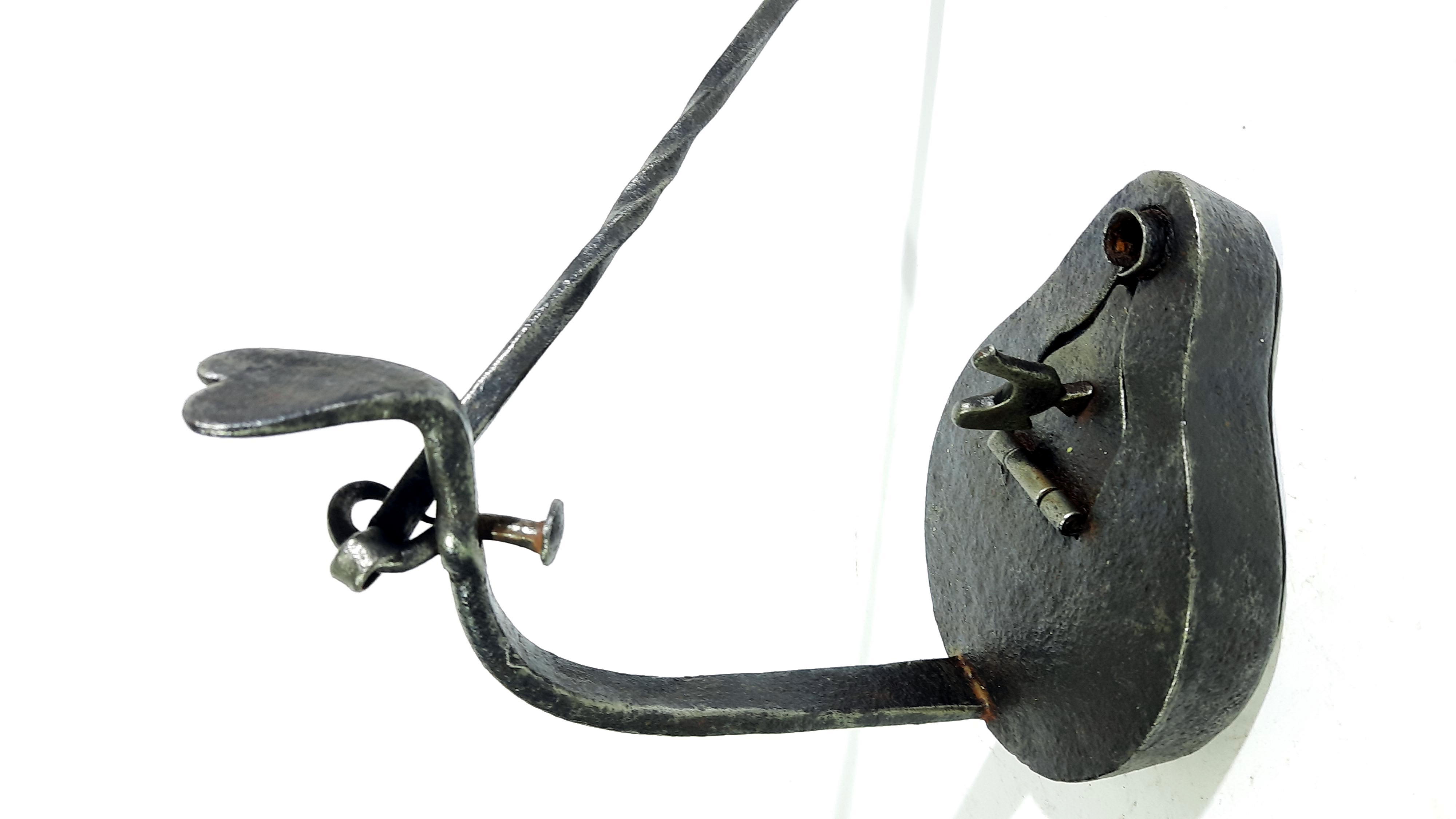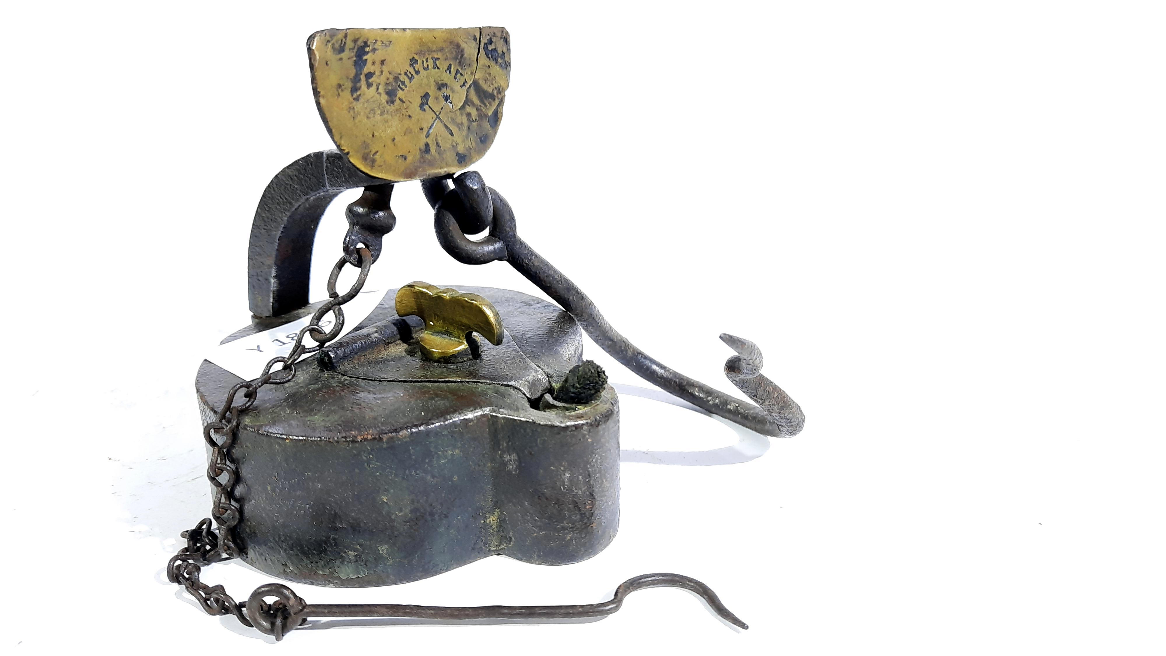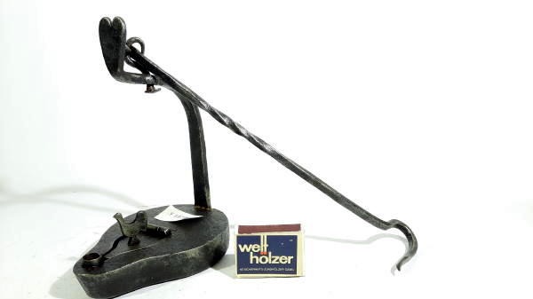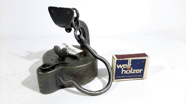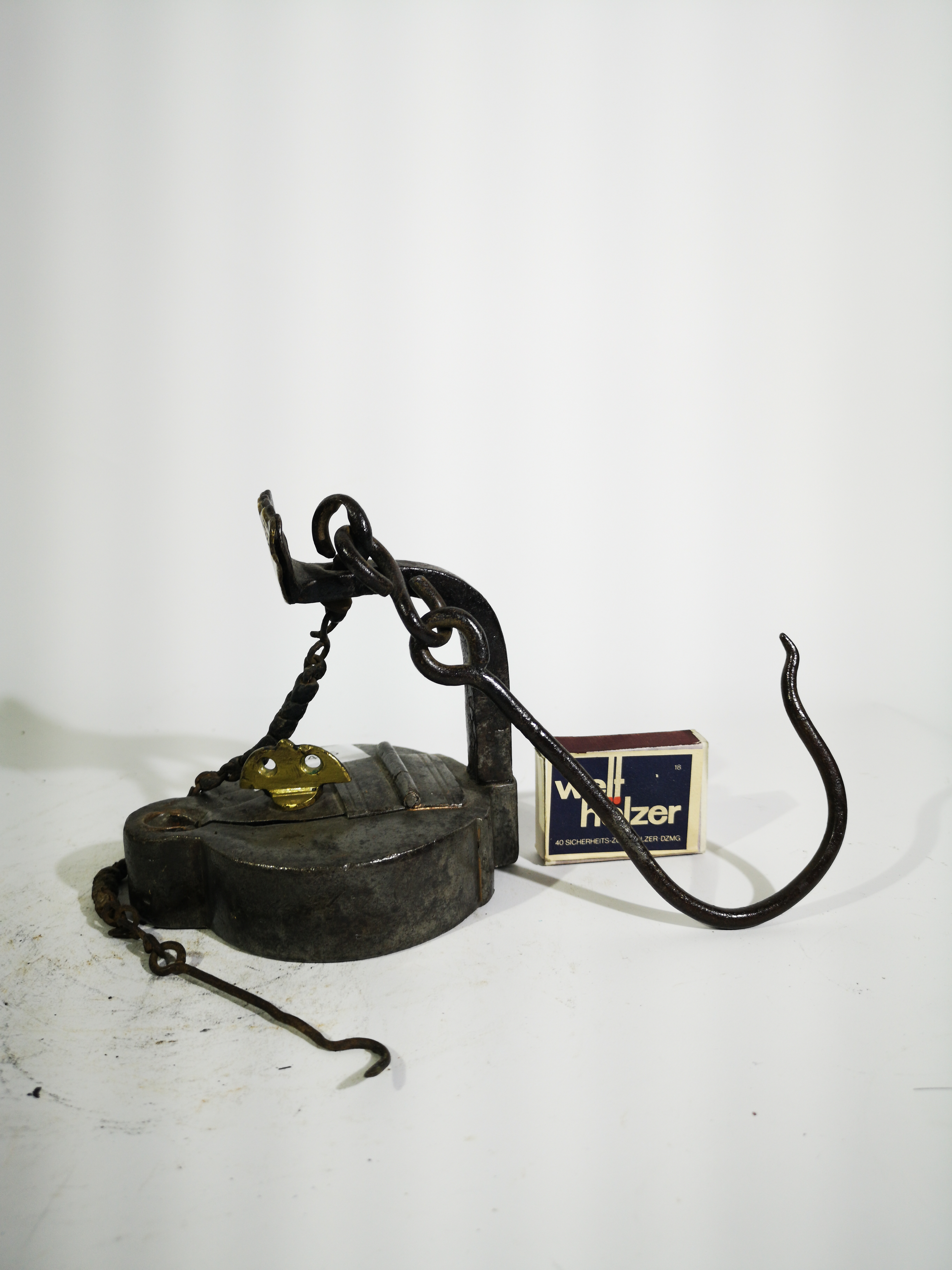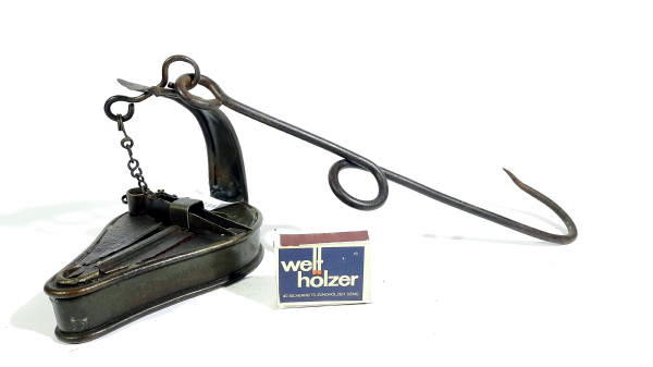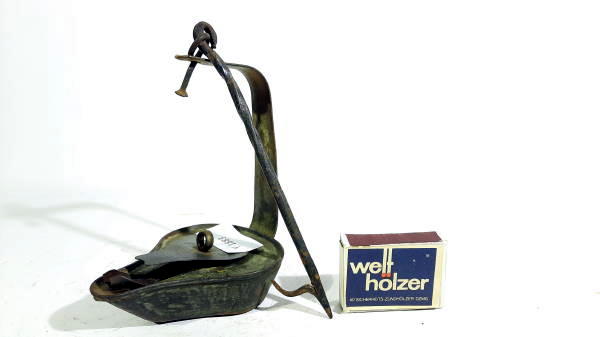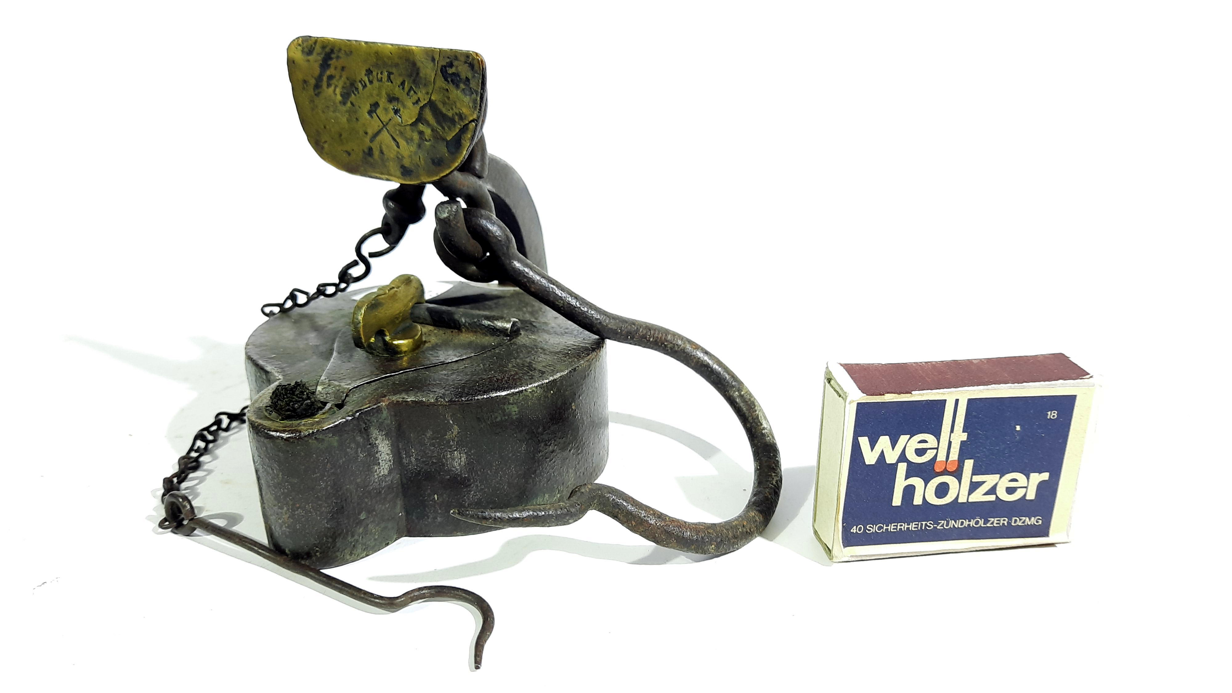 Topf Ober- u. Unterteil, gefalzt mit Seitenteil verbunden und weich verlötet, angelöteter, seitlich eingedrehter Bügel, flacher Schieberverschluß, langer, doppelt gekröpfter Spitzhaken, Dochtpinzette mit Kettchen. Herkunft Böhmen, Baujahr um 1880. Sehr guter Zustand. Condition: B+ Preis/Price: 90,- Euro |