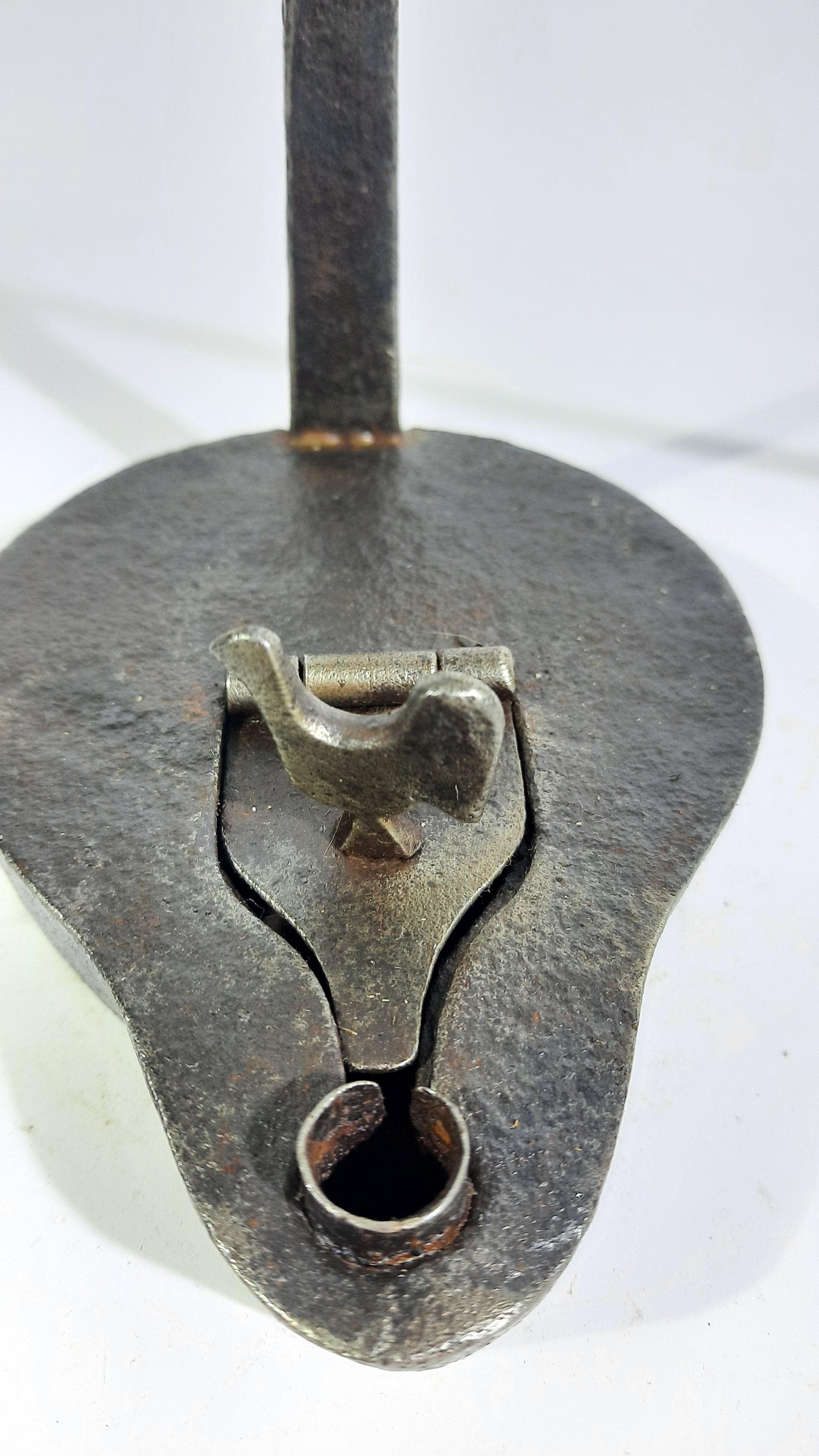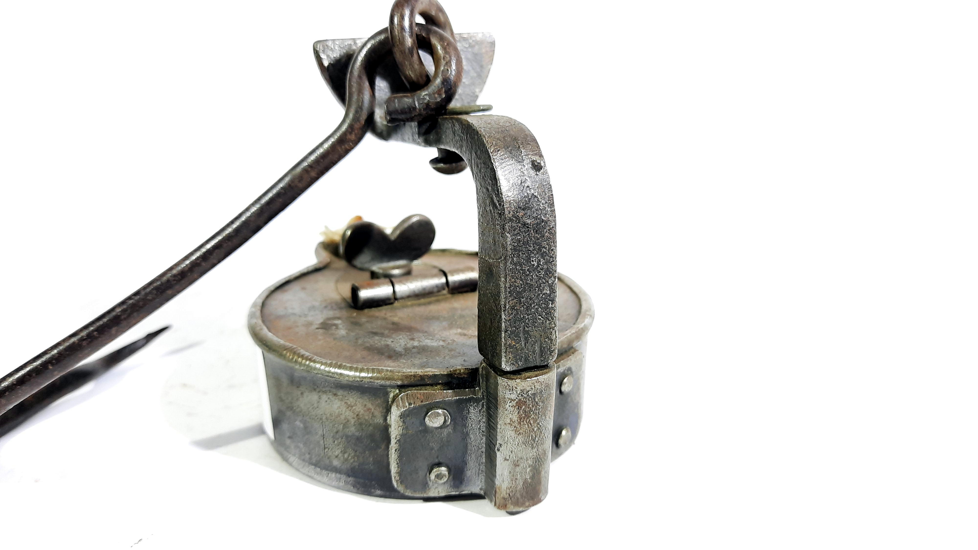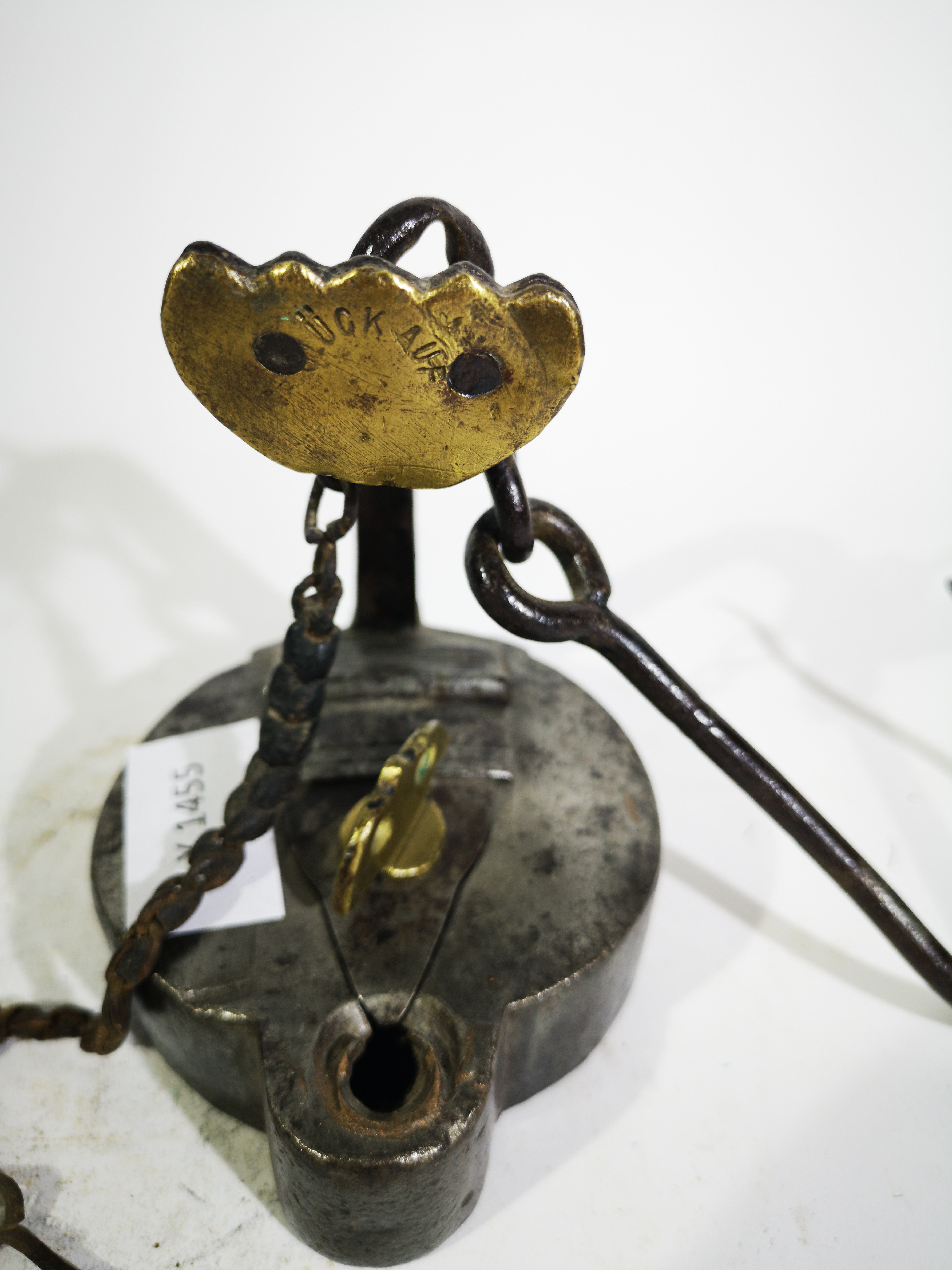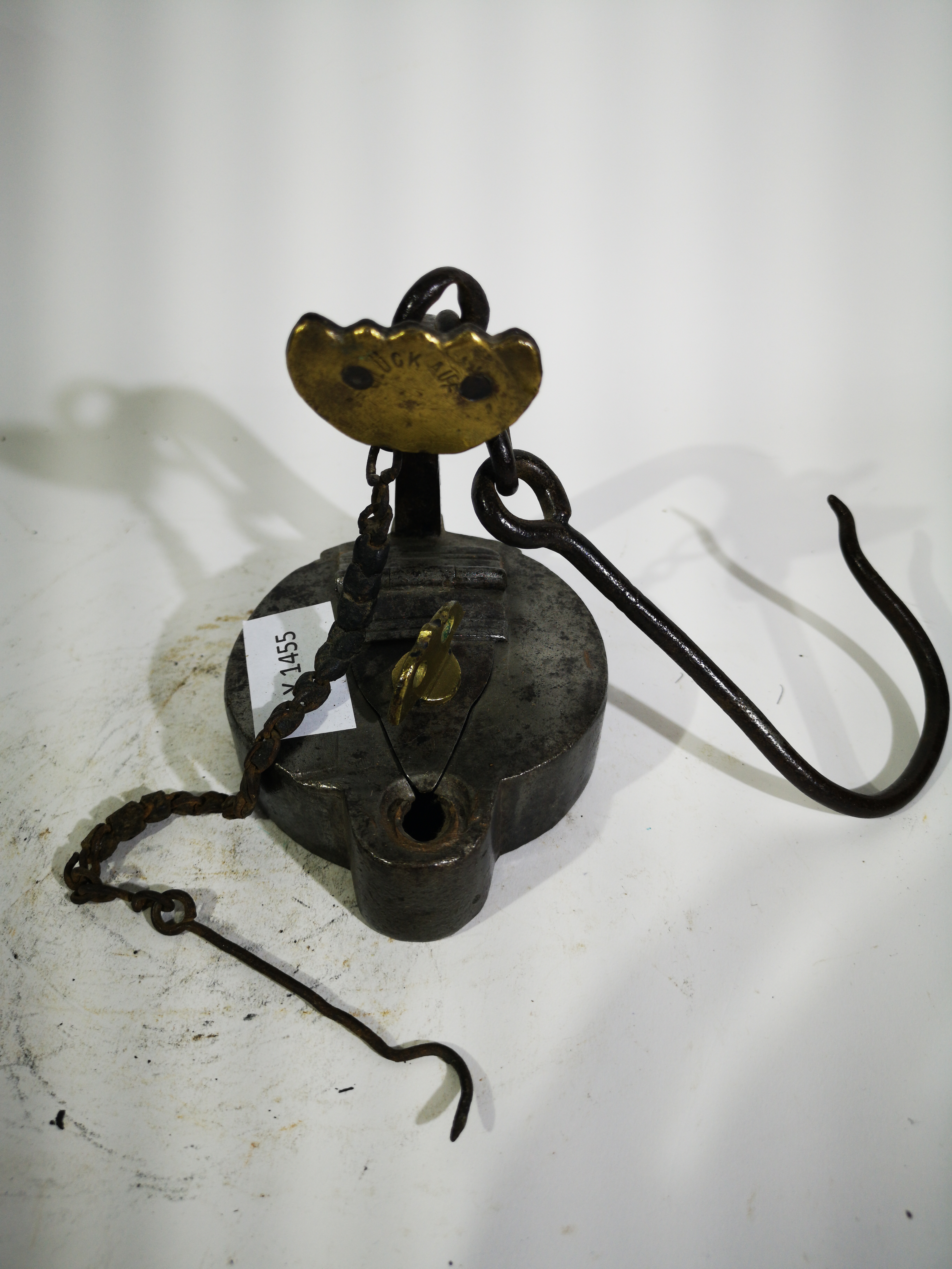 Topf Ober- u. Unterteil, gefalzt mit Seitenteil verbunden und weich verlötet, angelöteter, seitlich eingedrehter Bügel, flacher Schieberverschluß, langer, doppelt gekröpfter Spitzhaken, Dochtpinzette mit Kettchen. Herkunft Böhmen, Baujahr um 1880. Sehr guter Zustand. Condition: B+ Preis/Price: 90,- Euro |