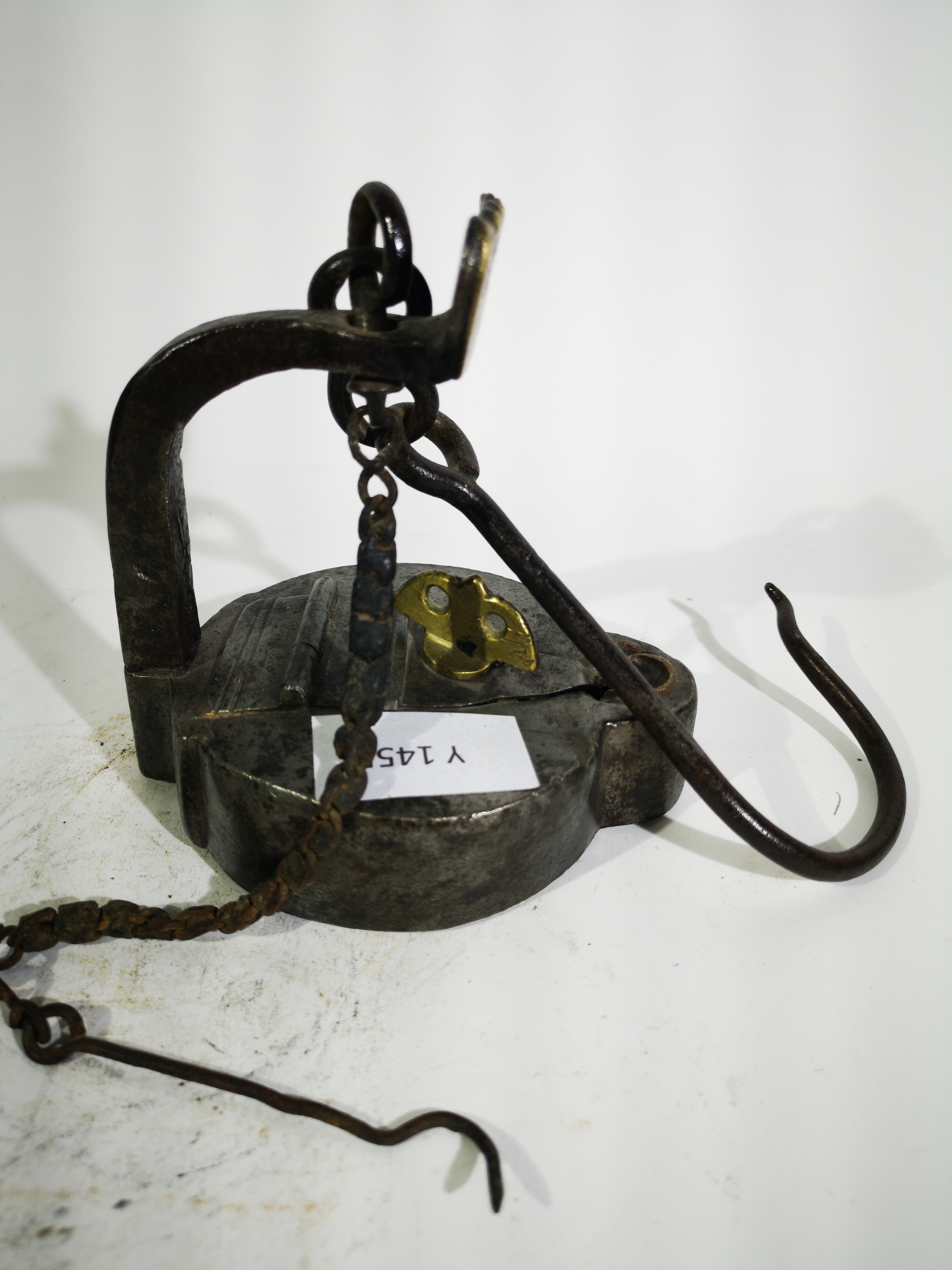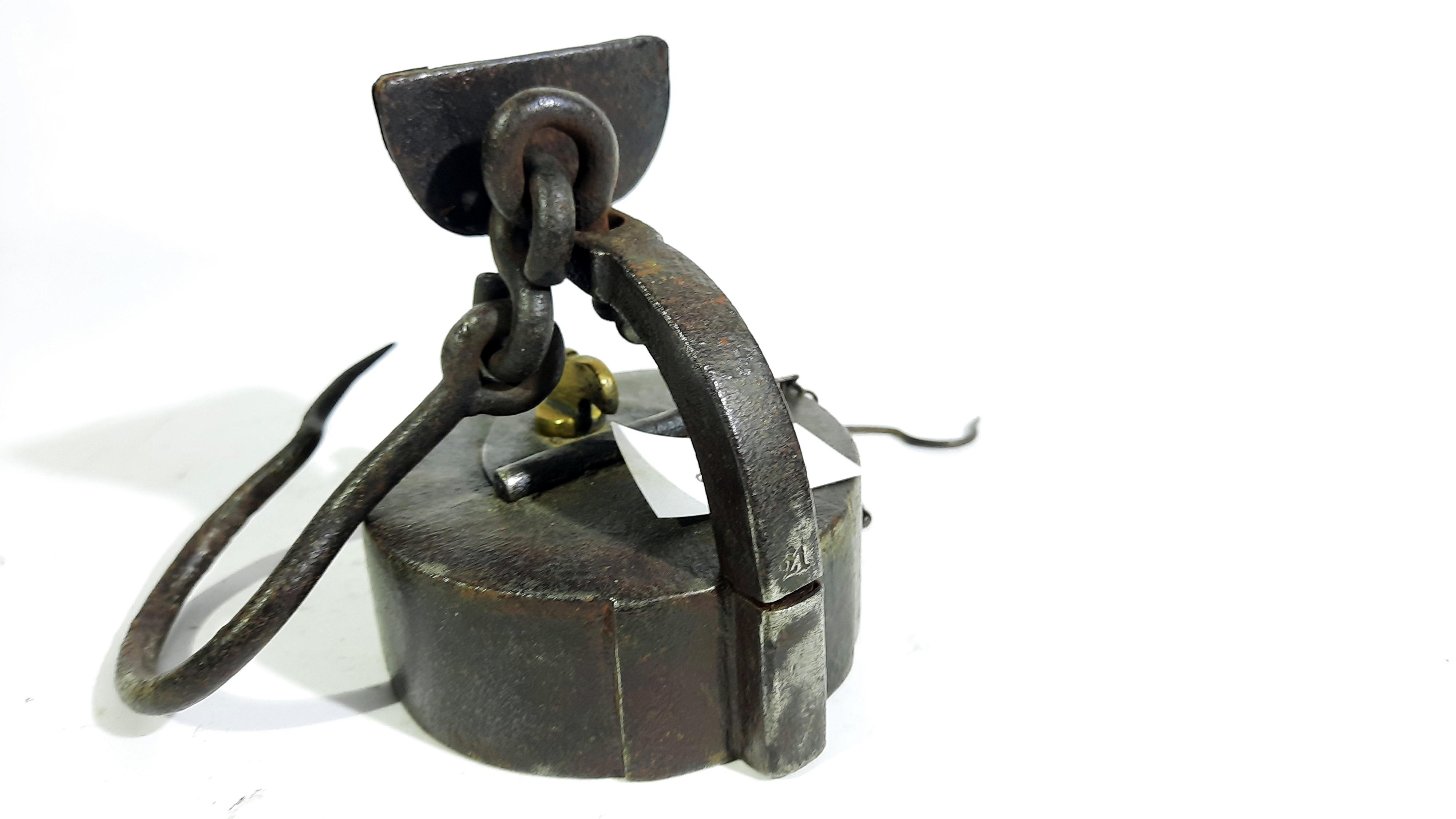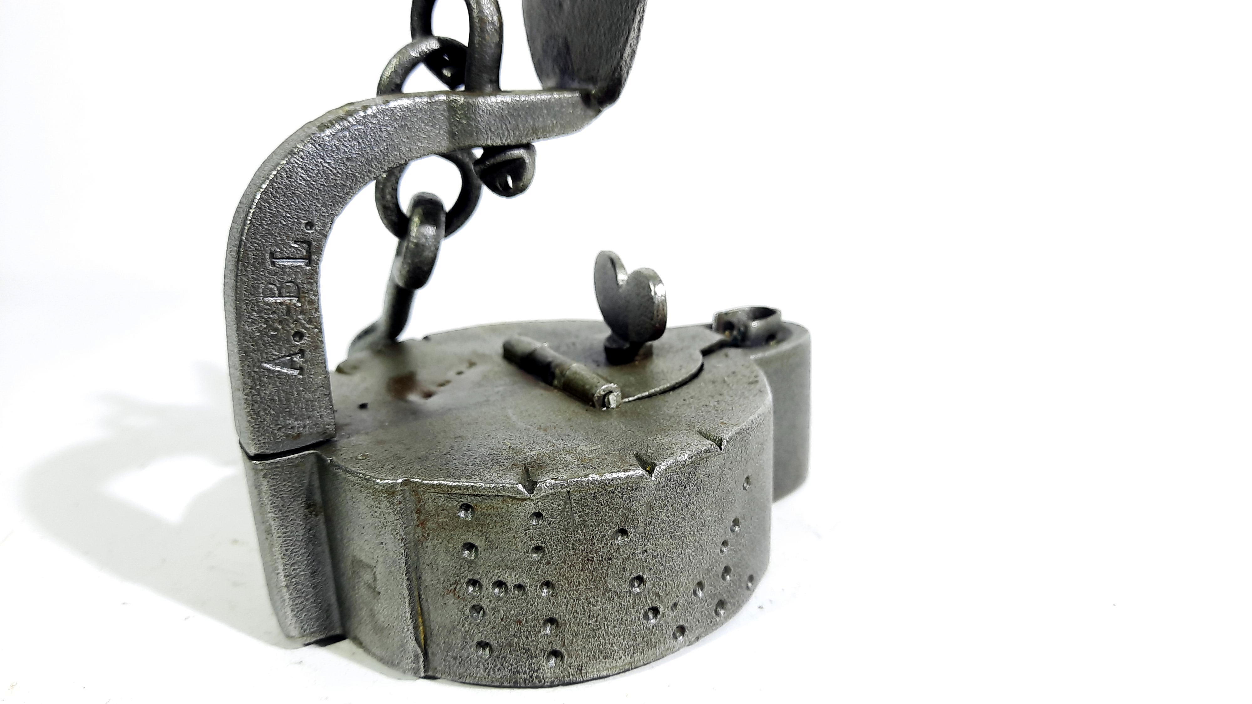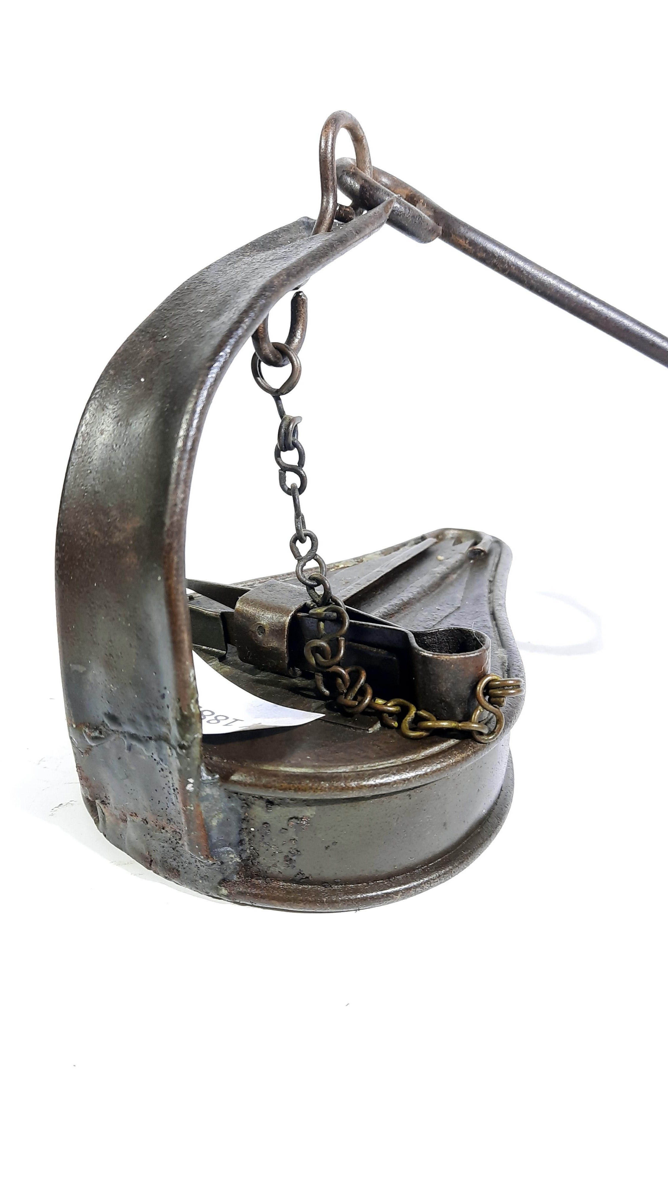 Topf Ober- u. Unterteil, gefalzt mit Seitenteil verbunden und weich verlötet, angelöteter, seitlich eingedrehter Bügel, flacher Schieberverschluß, langer, doppelt gekröpfter Spitzhaken, Dochtpinzette mit Kettchen. Herkunft Böhmen, Baujahr um 1880. Sehr guter Zustand. Condition: B+ Preis/Price: 90,- Euro |