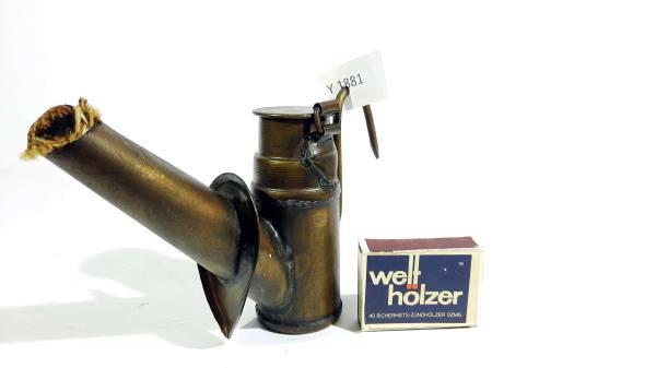 D: Normale Gebrauchsspuren, fehlende oder beschädigte Teile, von außen nicht sichtbare Schäden wie Rostlöcher im Boden einer Karbidlampe oder nicht funktionierender Zünder bei einer Wetterlampe. | D: Normal signs of use, missing or damaged parts, from the outside not visible damage such as rust holes in the bottom of a carbide lamp or not functioning igniter in a safety lamp. |