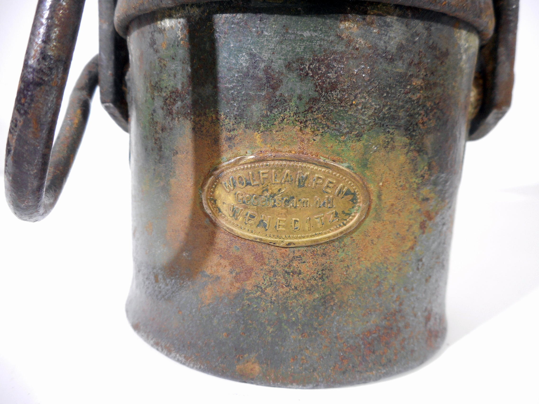 D: Normale Gebrauchsspuren, fehlende oder beschädigte Teile, von außen nicht sichtbare Schäden wie Rostlöcher im Boden einer Karbidlampe oder nicht funktionierender Zünder bei einer Wetterlampe. | D: Normal signs of use, missing or damaged parts, from the outside not visible damage such as rust holes in the bottom of a carbide lamp or not functioning igniter in a safety lamp. |